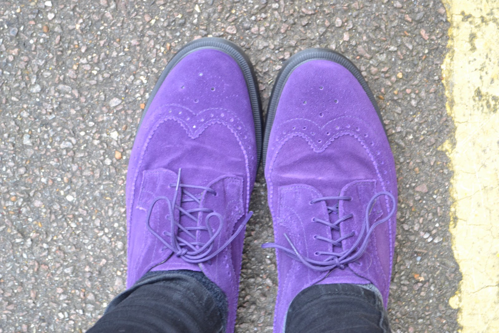 Having UK size 10 feet means I can hardly buy shoes anywhere. It also means when I find a pair of shoes I like, I wear them to death and then buy a new pair. The shoes themselves aren’t particularly expensive, mostly around £20, but the regularity with which I need to replace them makes this a costly venture. So when Maja took me into Dr Martens the other day to look at some sexysexy killer heel black shoe-boots she wanted, I found myself perusing their wares. I fell in love with these amazing purple suede brogues with a thick sole.